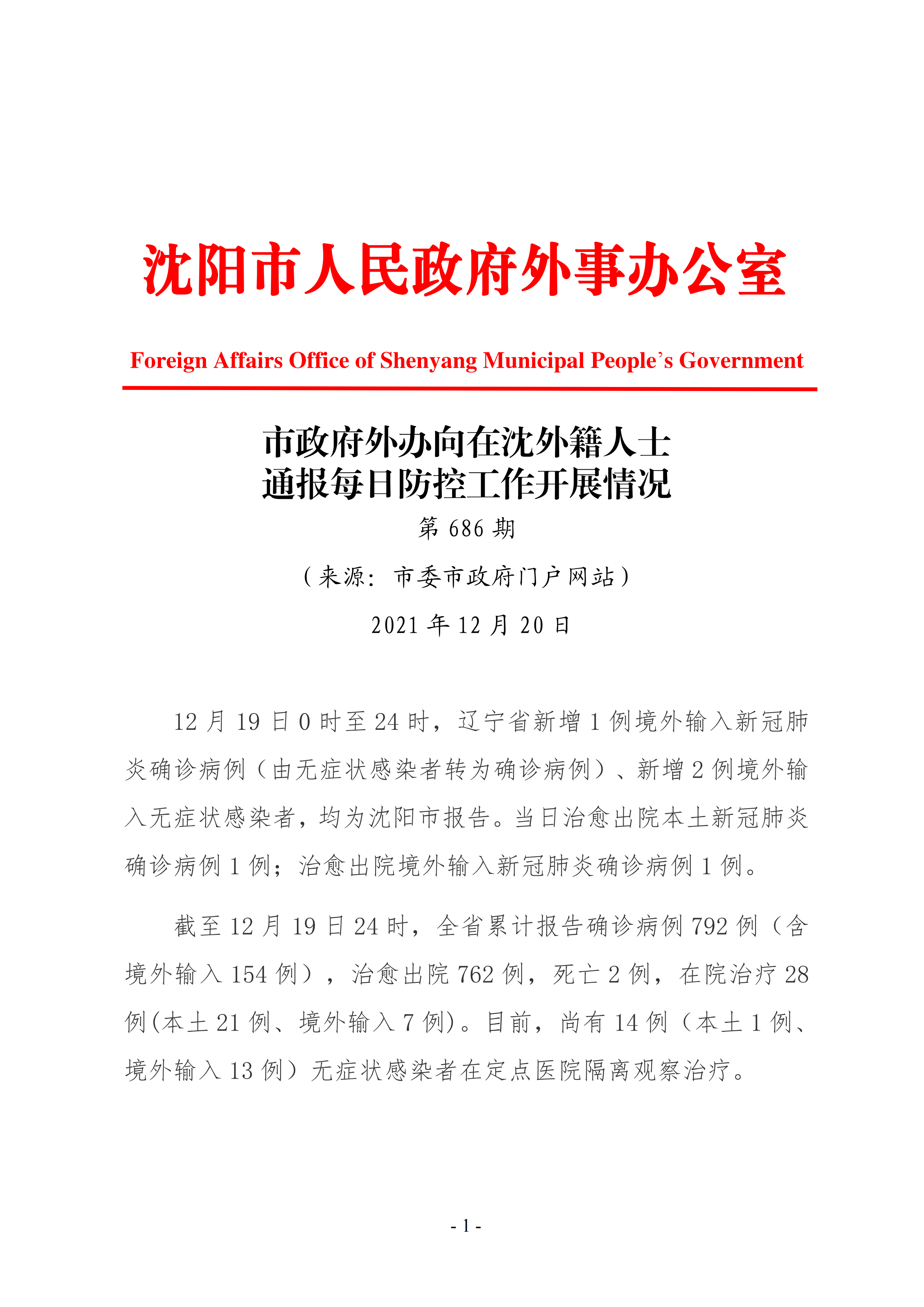 12月20日市政府外办向在沈外籍人士通报每日防控工作开展情况
