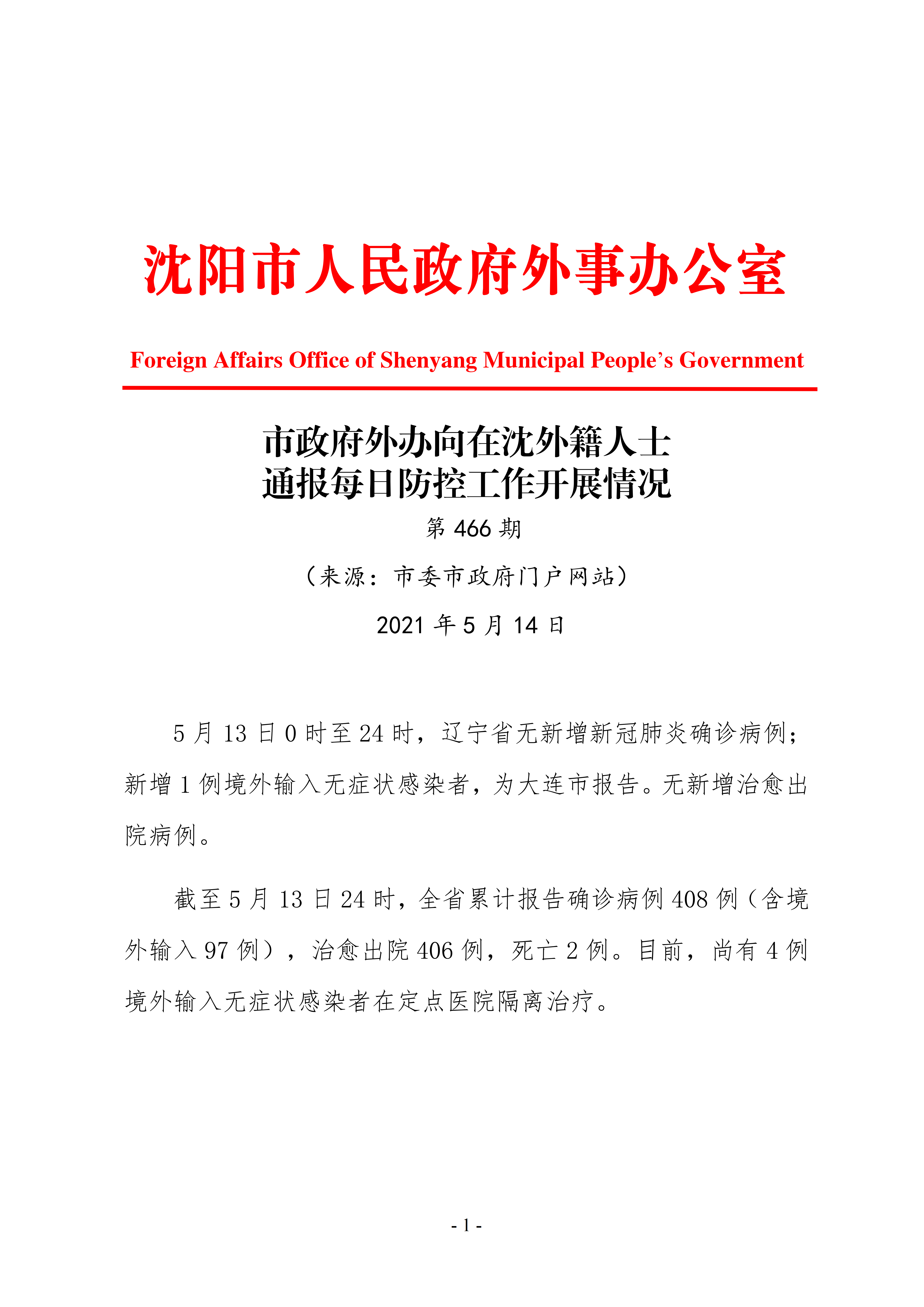 5月14日市政府外办向在沈外籍人士通报每日防控工作开展情况
