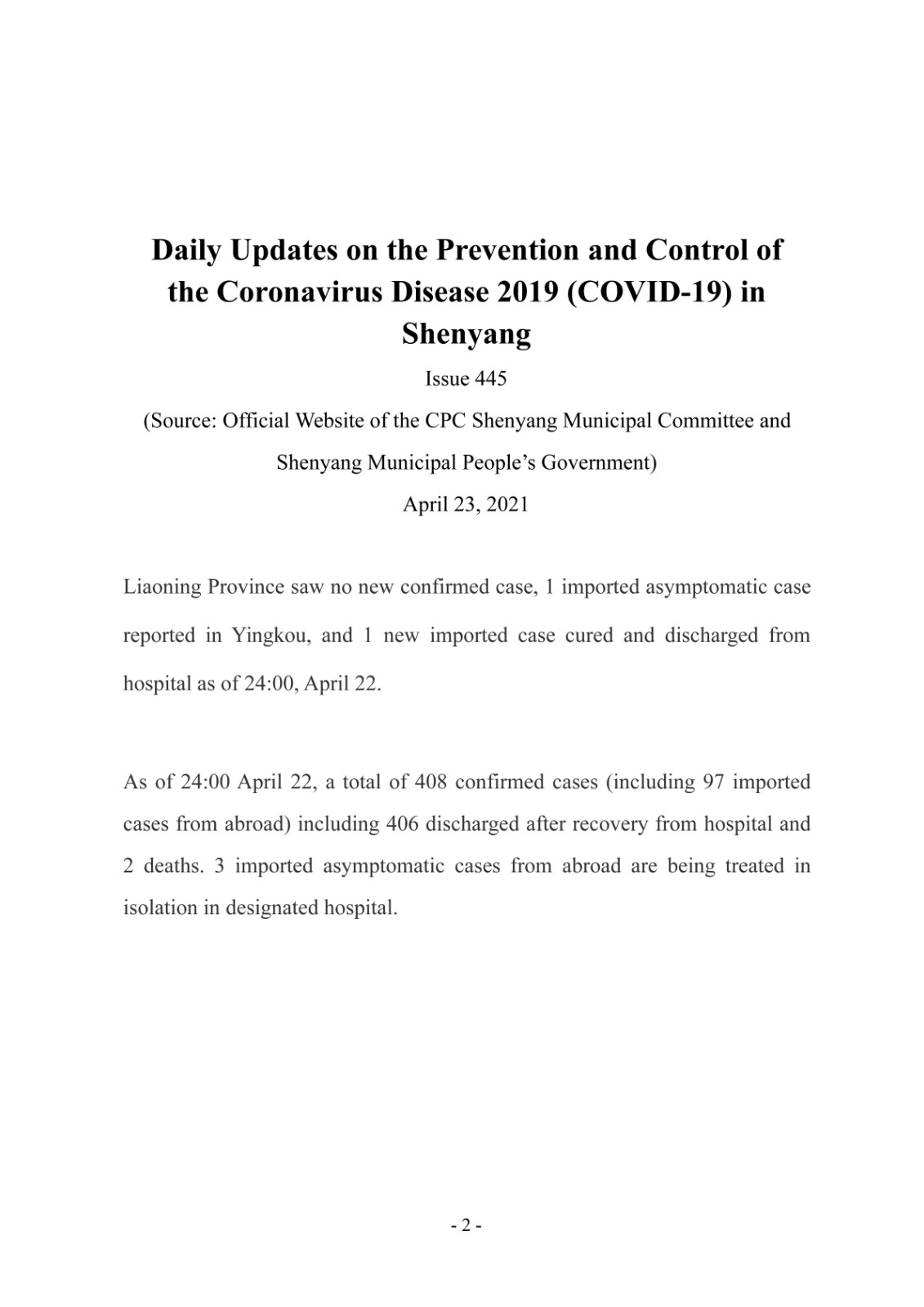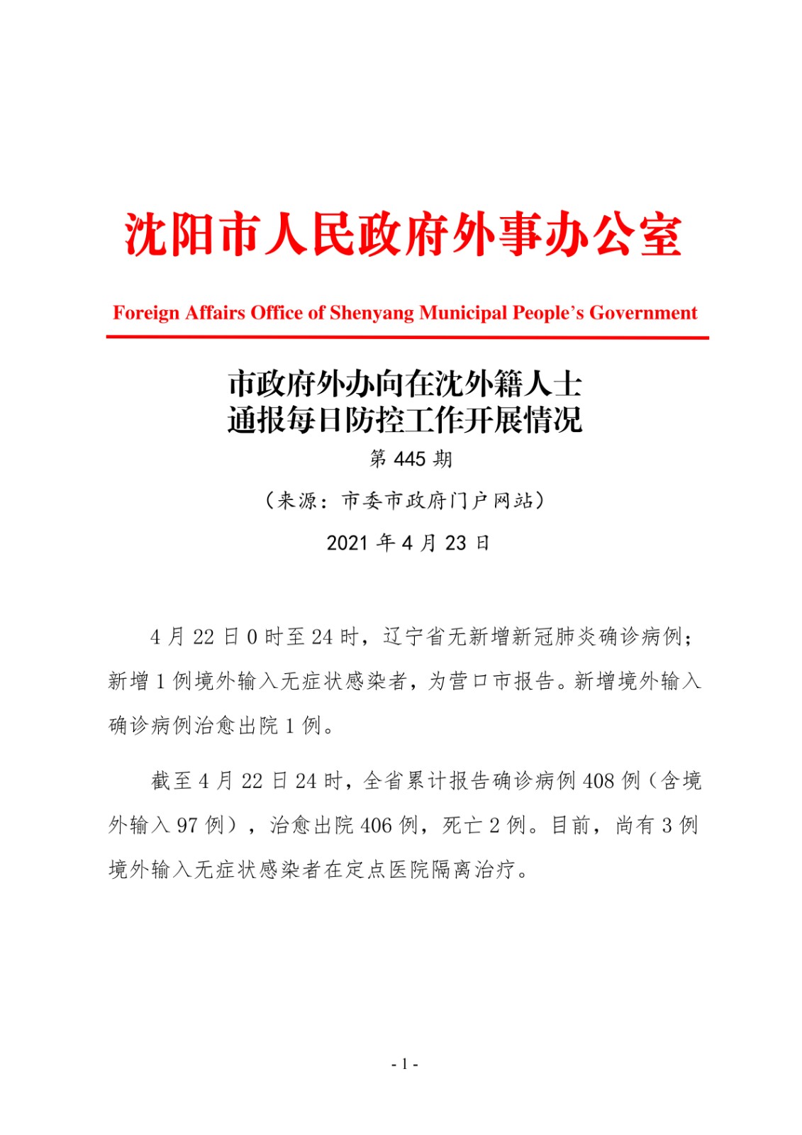 4月23日市政府外办向在沈外籍人士通报每日防控工作开展情况
